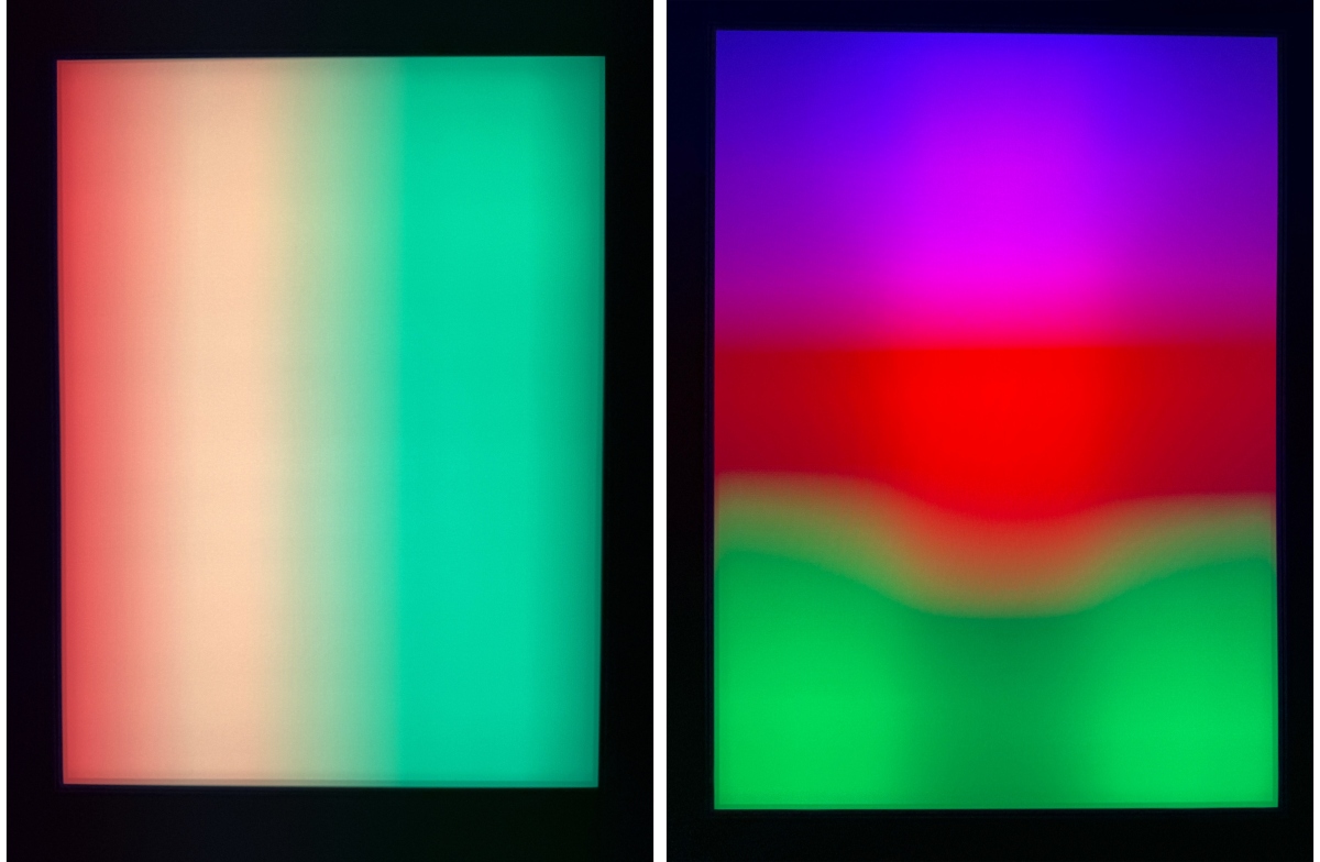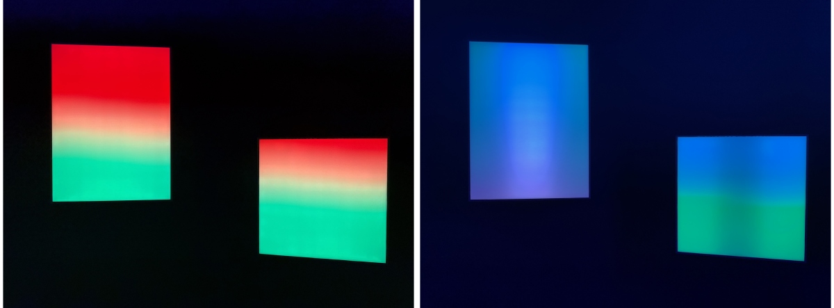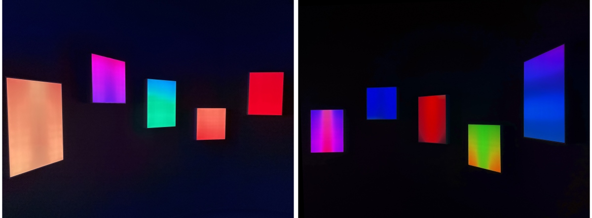本作は肉眼ではただ白く発光するパネル。スマートフォンのカメラを通して見ると、画面にはさまざまな色のストライプが浮かび上がる。