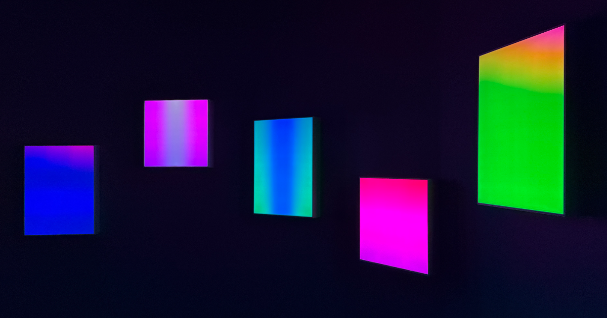 本作は肉眼ではただ白く発光するパネル。スマートフォンのカメラを通して見ると、画面にはさまざまな色のストライプが浮かび上がる。